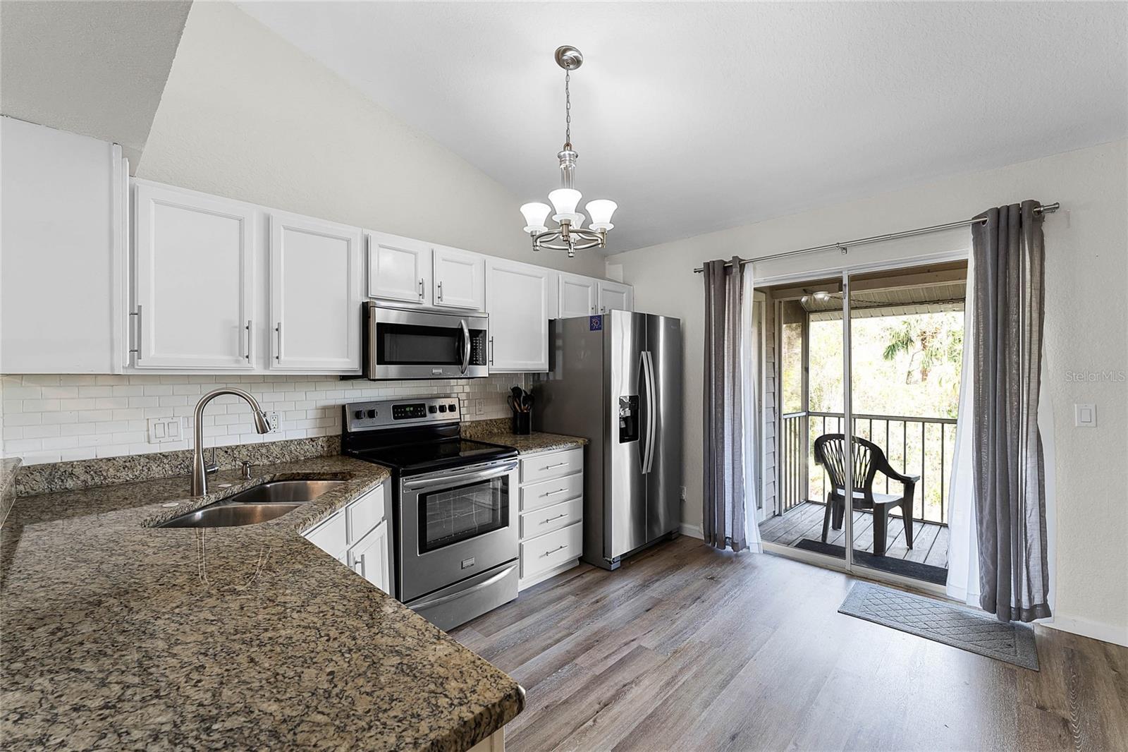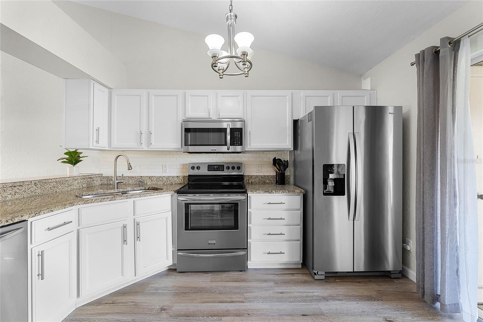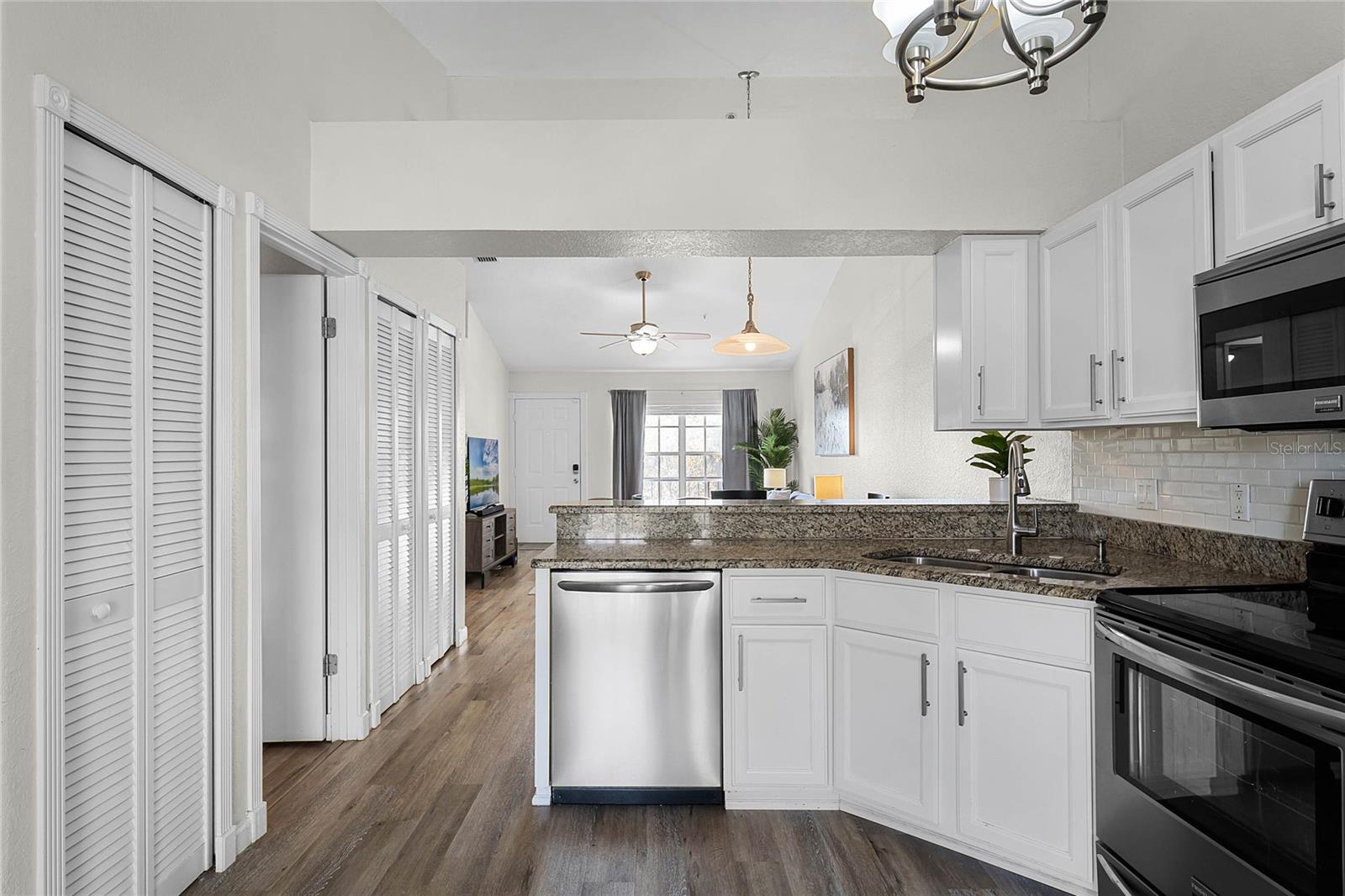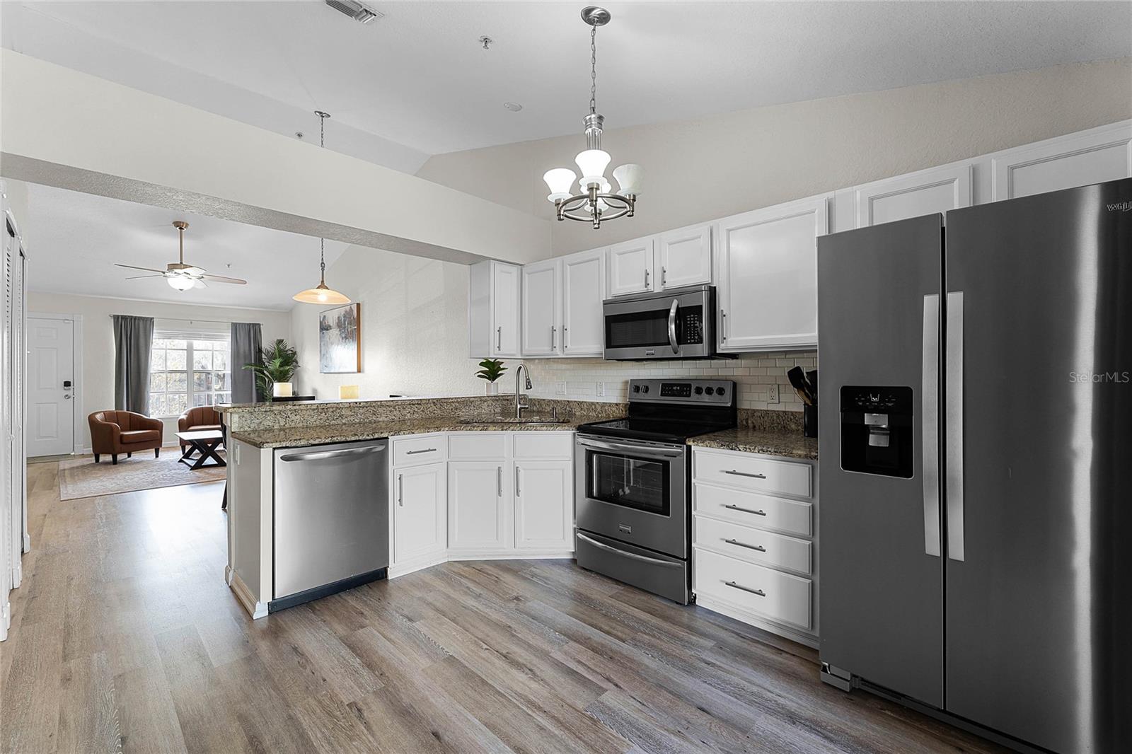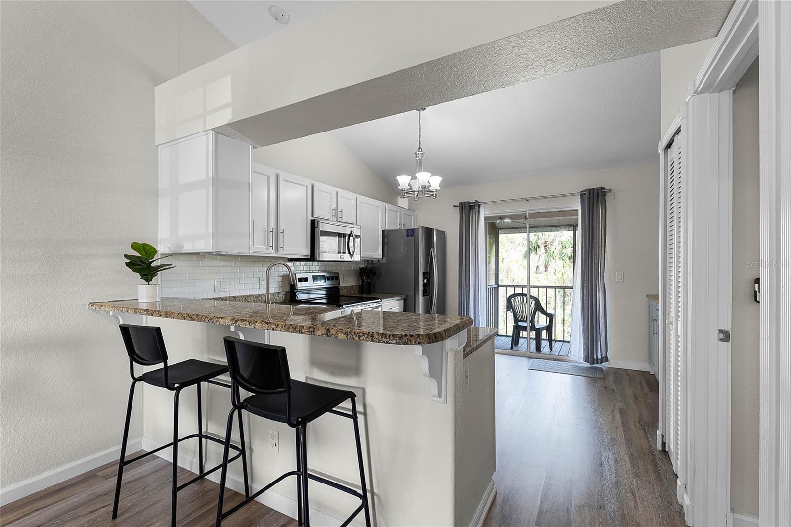 Step inside to a completely updated unit. The main living space features a large, picture window, updated flooring and cozy dining area. The spacious, updated kitchen comes complete with breakfast bar and newer stainless steel appliances. Need your morning caffeine fix? Your very own coffee bar awaits, perfect for brewing your favorite blends.
