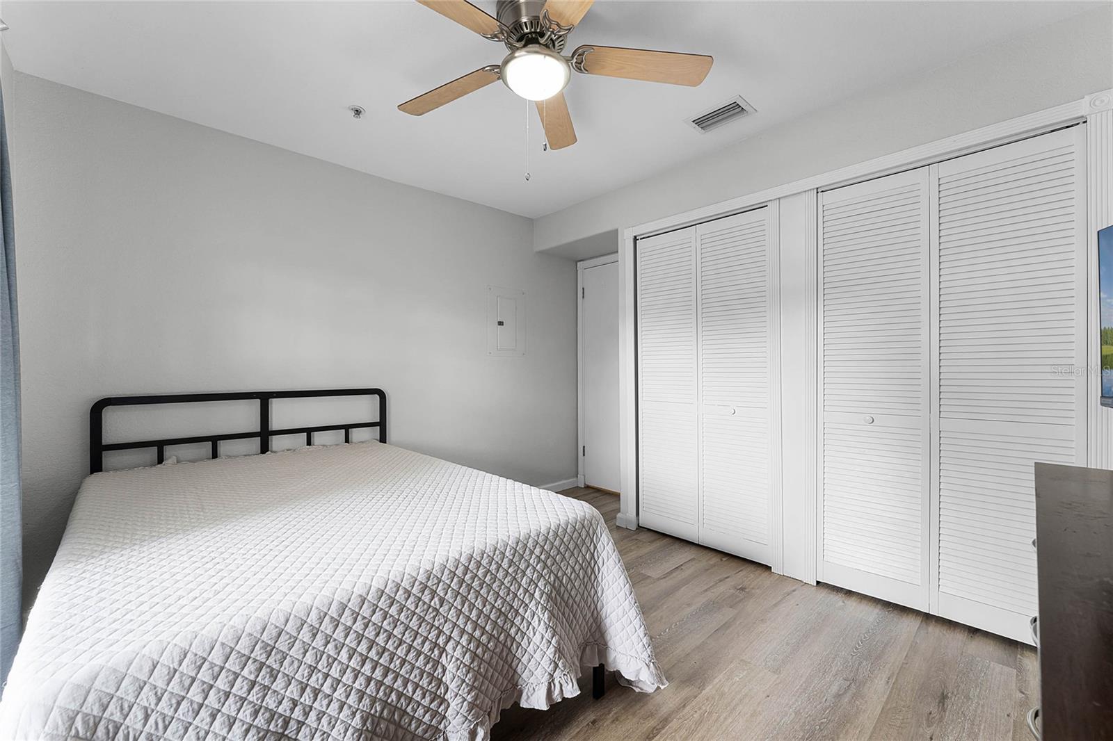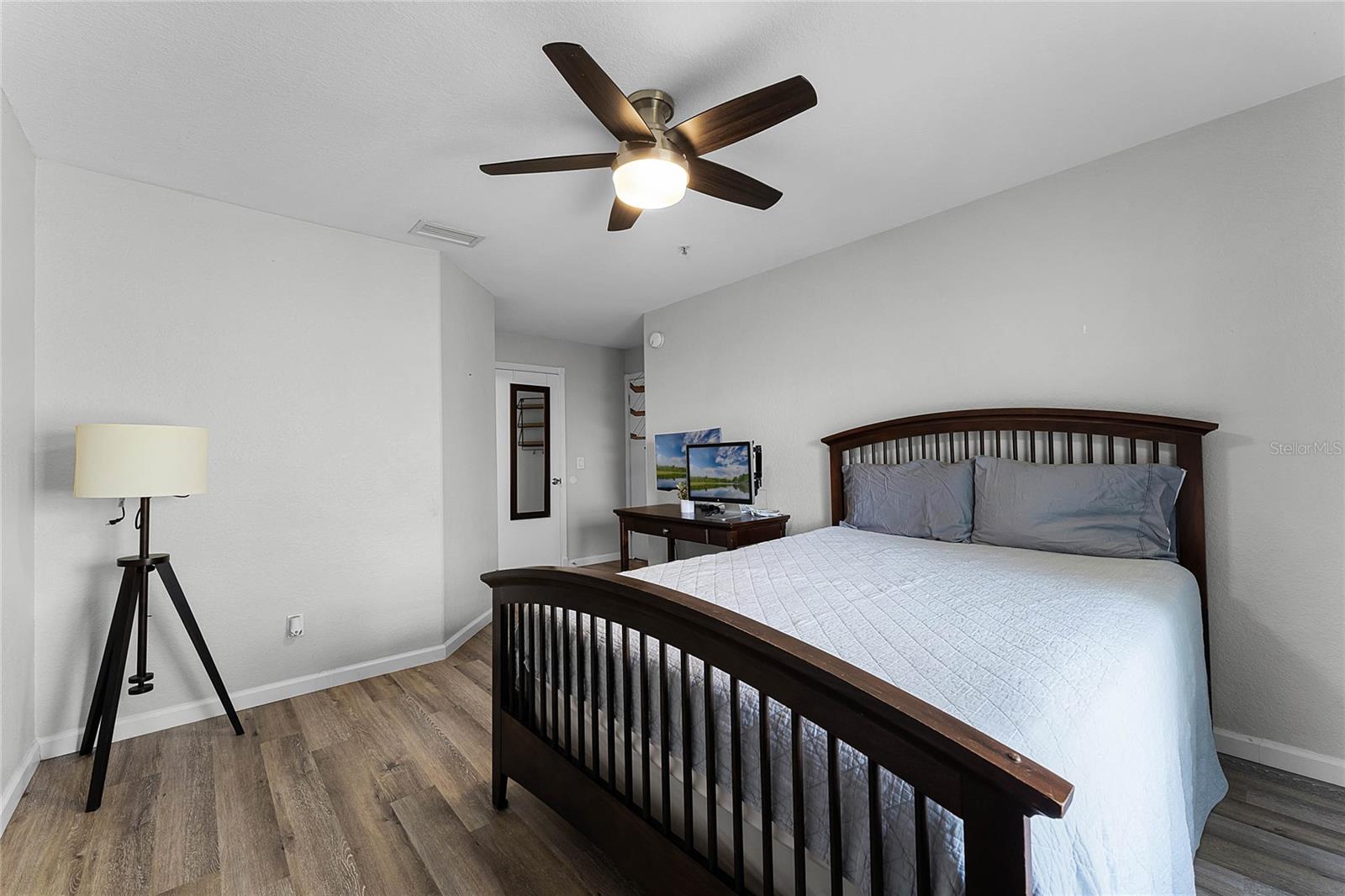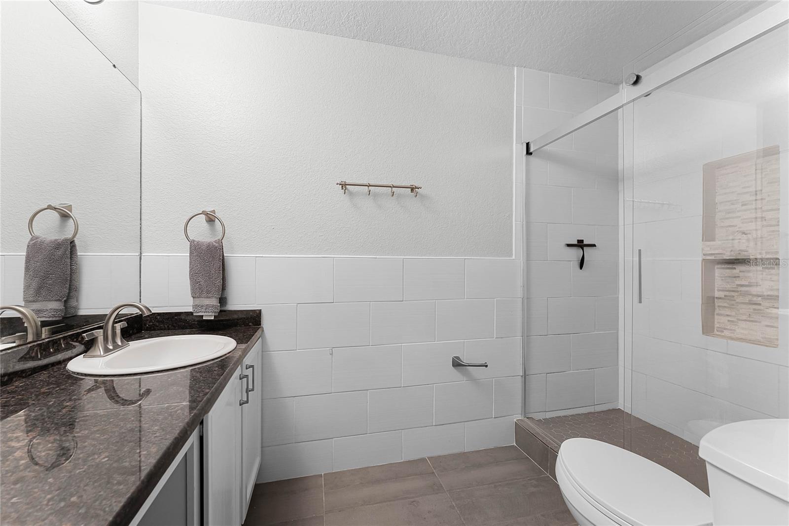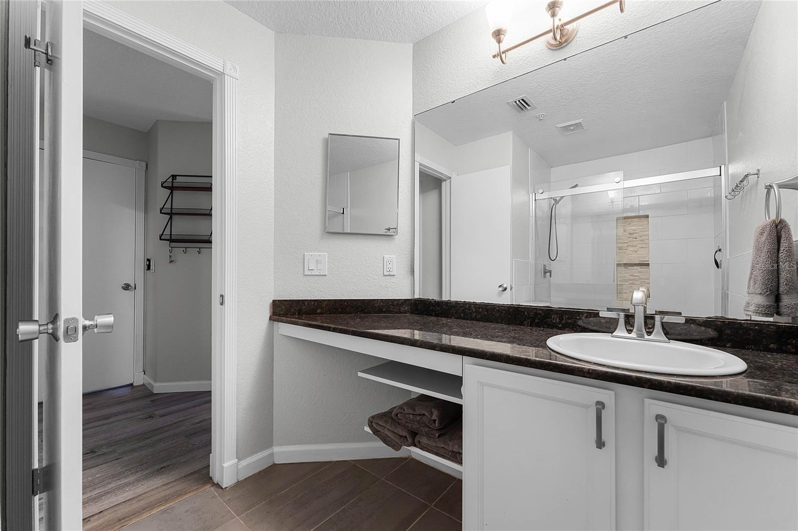 The primary bedroom is generously sized with an en-suite, renovated bathroom and walk-in closet. The second bedroom boasts two closets and adjacent full bathroom. Just off the second bathroom is the laundry closet- a stackable unit fits perfectly in the space.