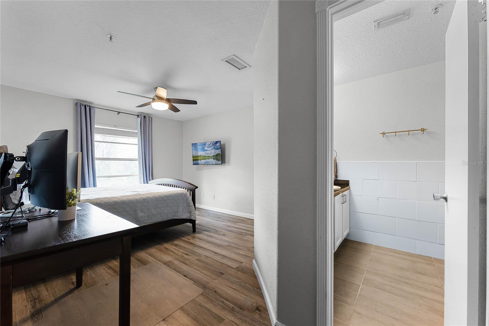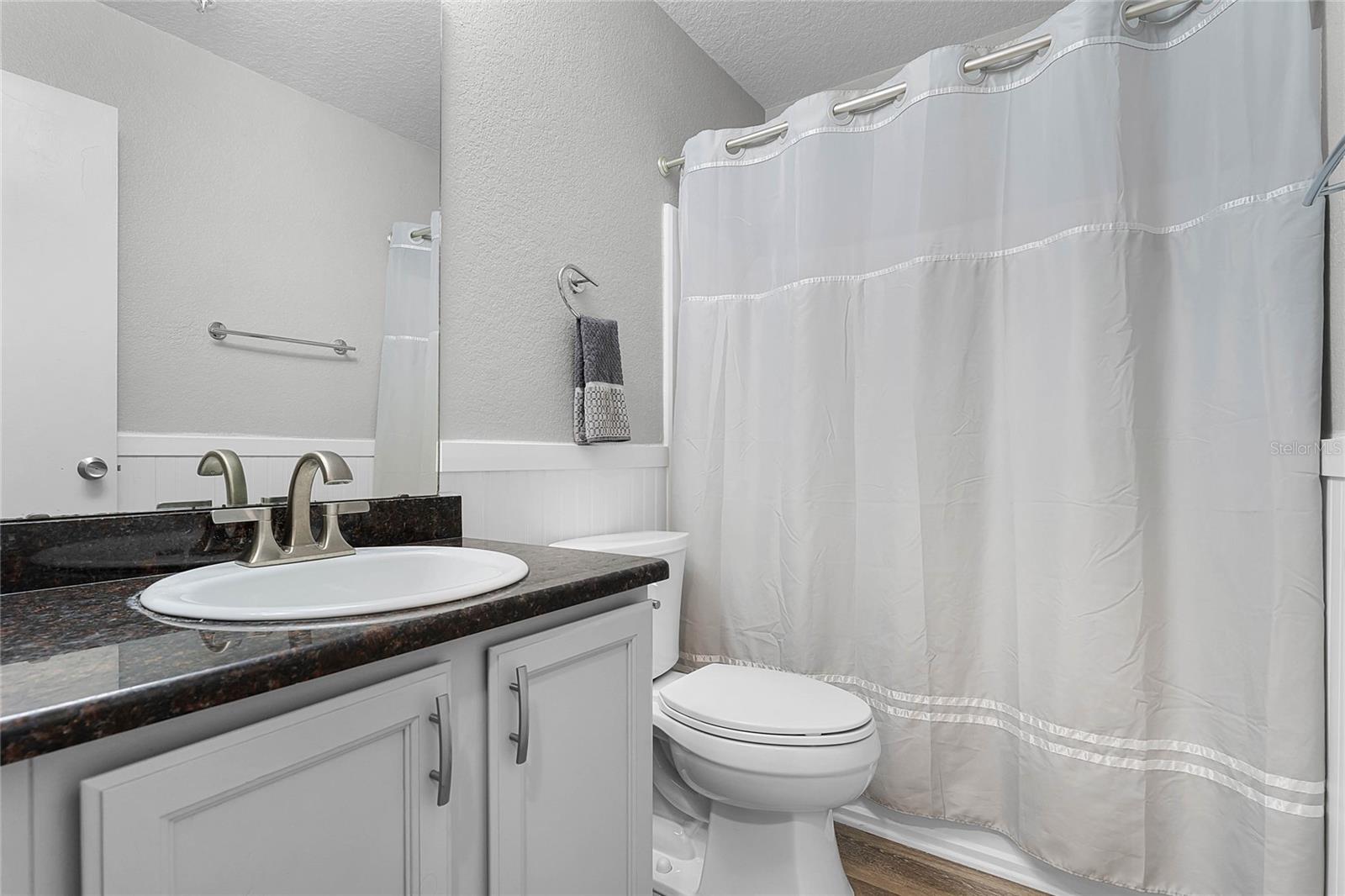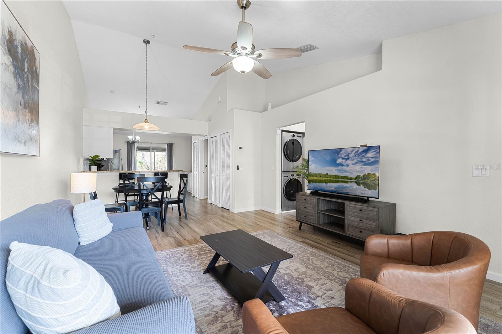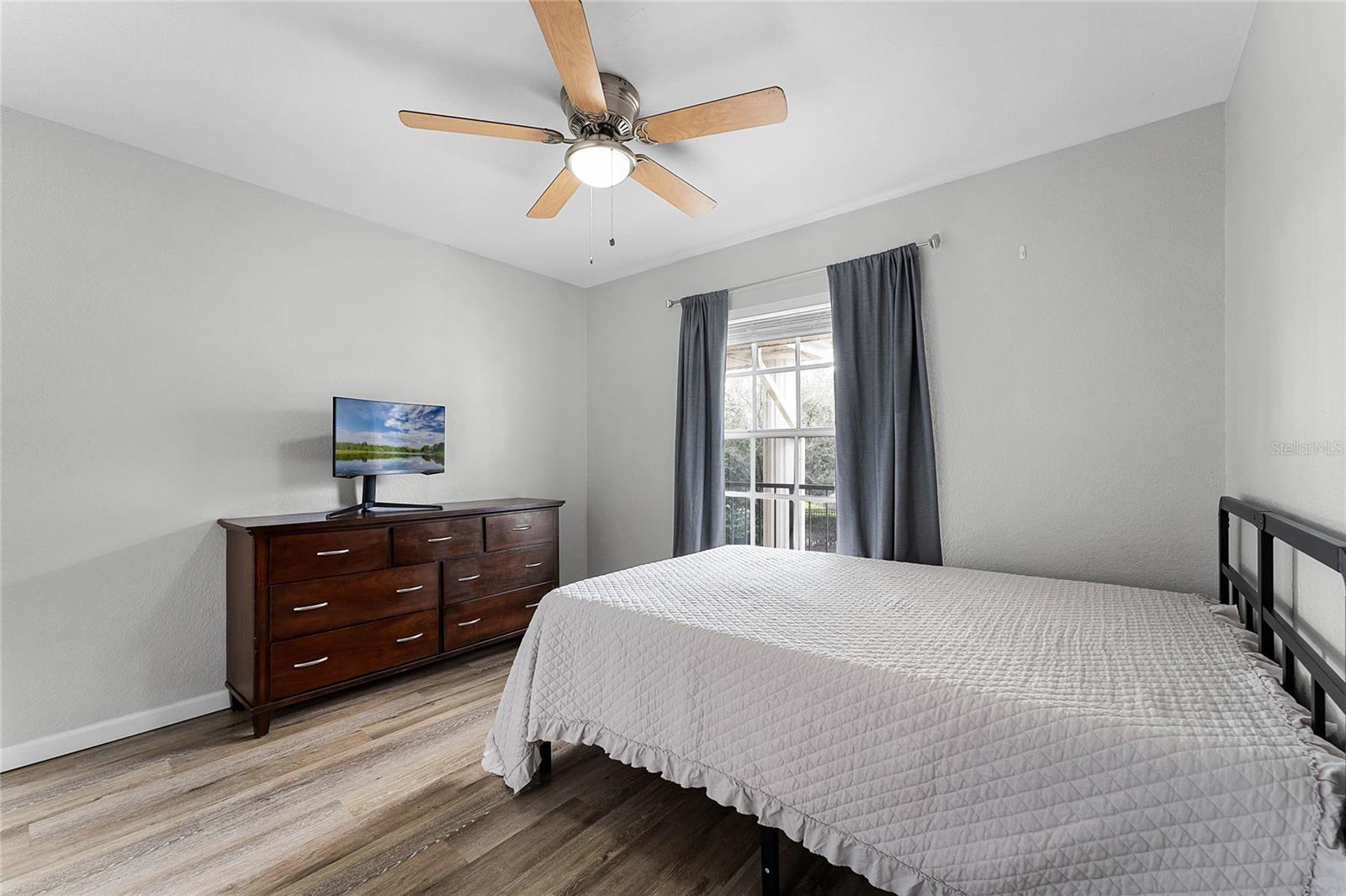 The primary bedroom is generously sized with an en-suite, renovated bathroom and walk-in closet. The second bedroom boasts two closets and adjacent full bathroom. Just off the second bathroom is the laundry closet- a stackable unit fits perfectly in the space.