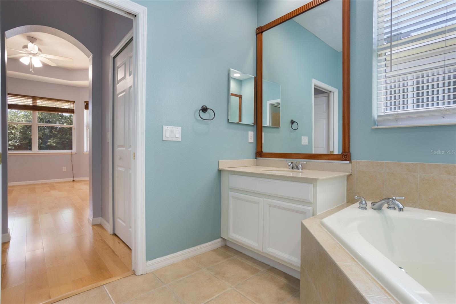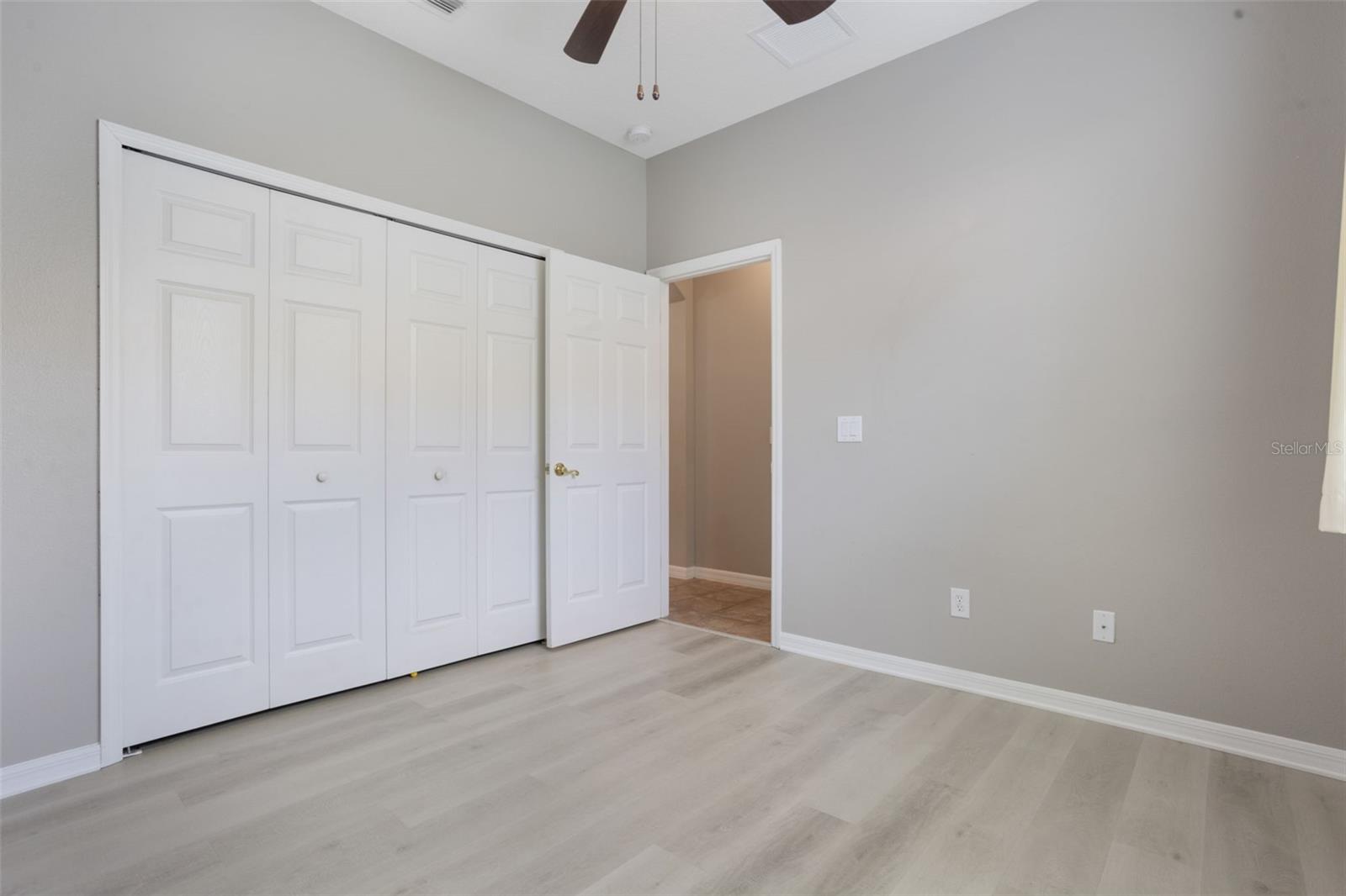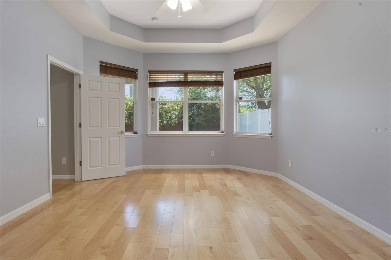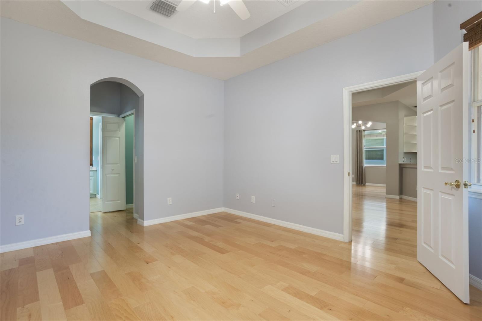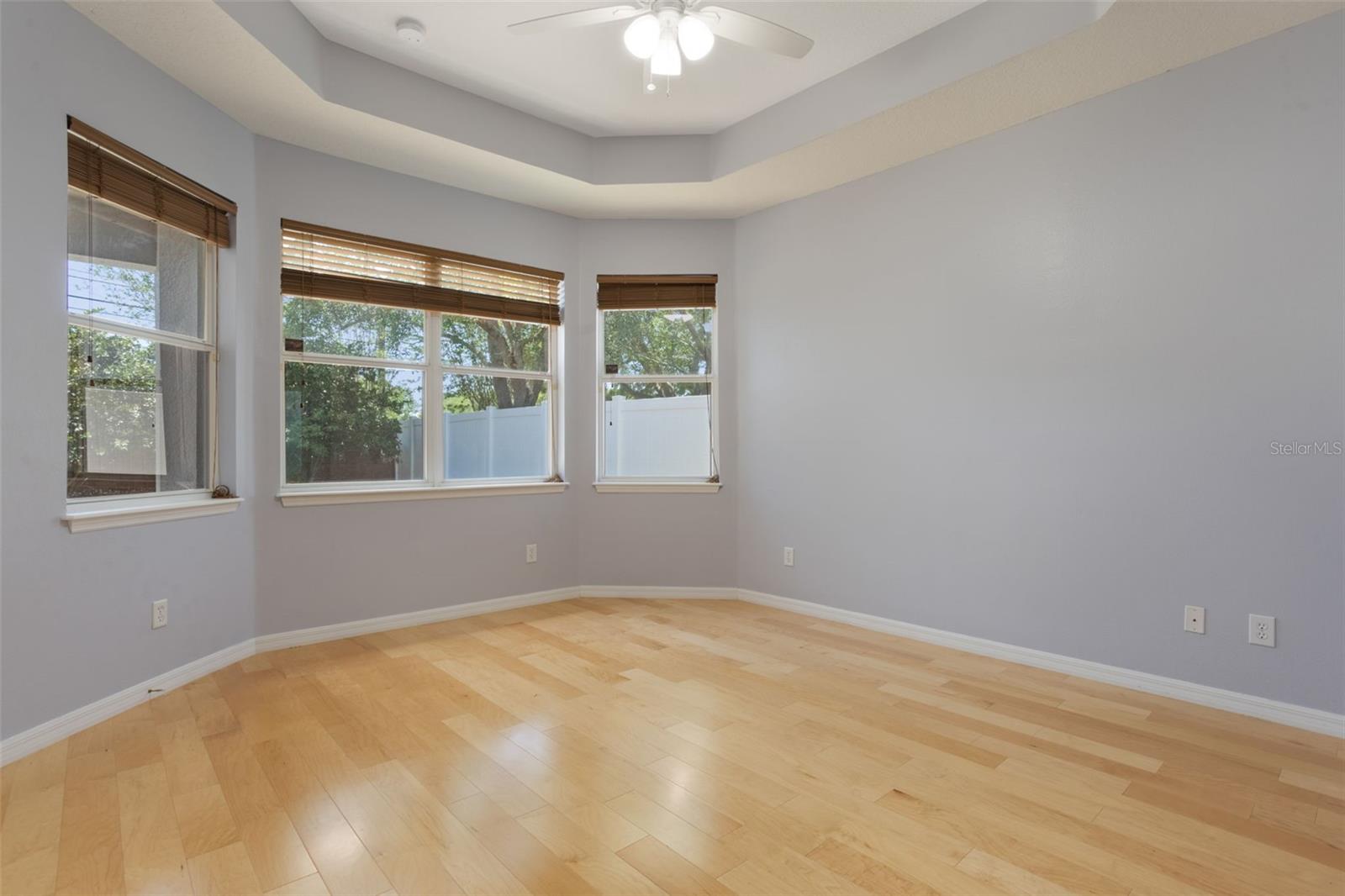 The home boasts two ancillary bedrooms outfitted with new luxury vinyl plank flooring along with a full bathroom with bathtub for little ones. The primary suite offers a spacious retreat featuring tray ceilings and maple hardwood flooring. Picture windows to the backyard allow golden afternoon light while dual closets leave ample room for clothing and storage. The primary suite also features dual vanities, a garden tub and separate shower stall.