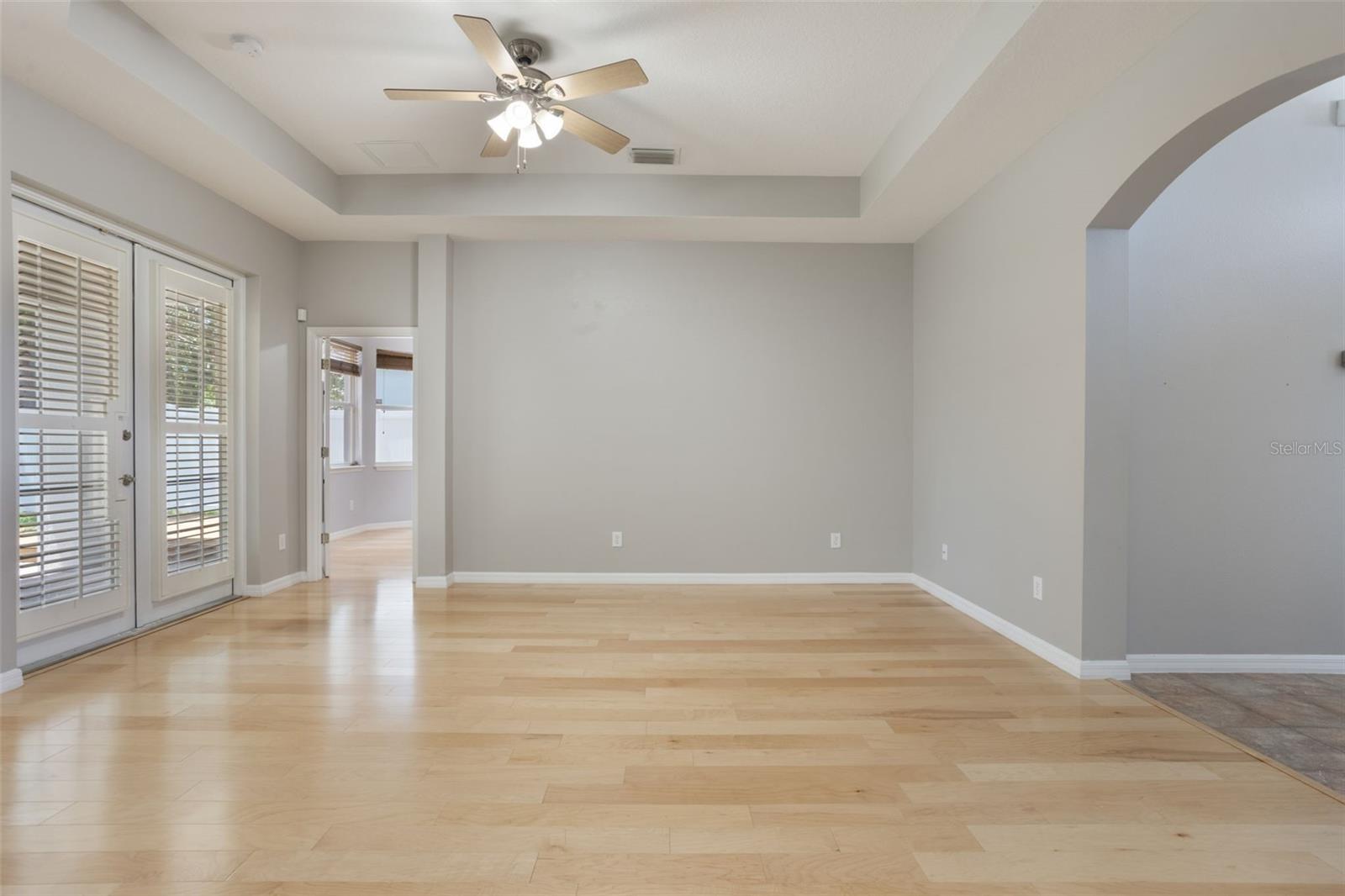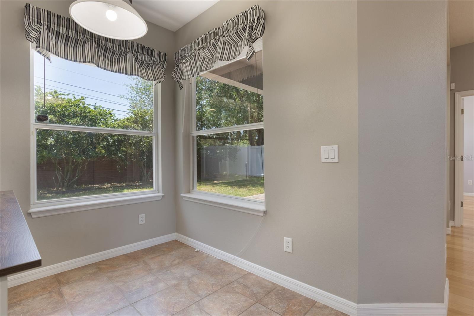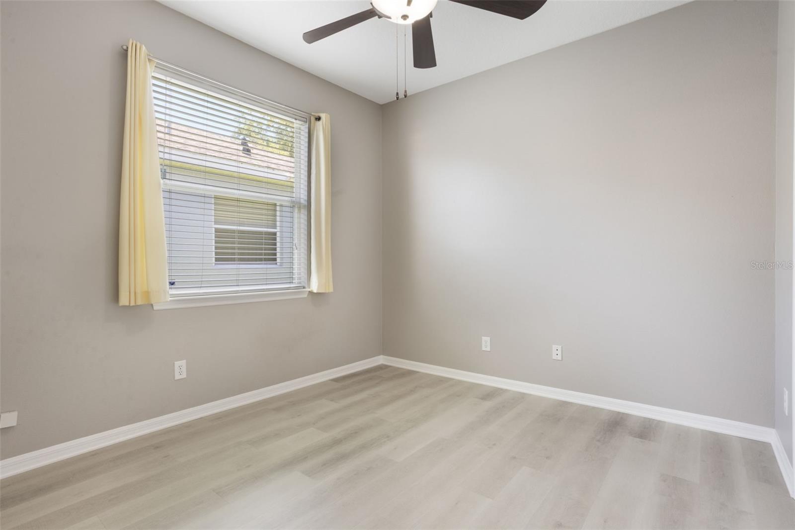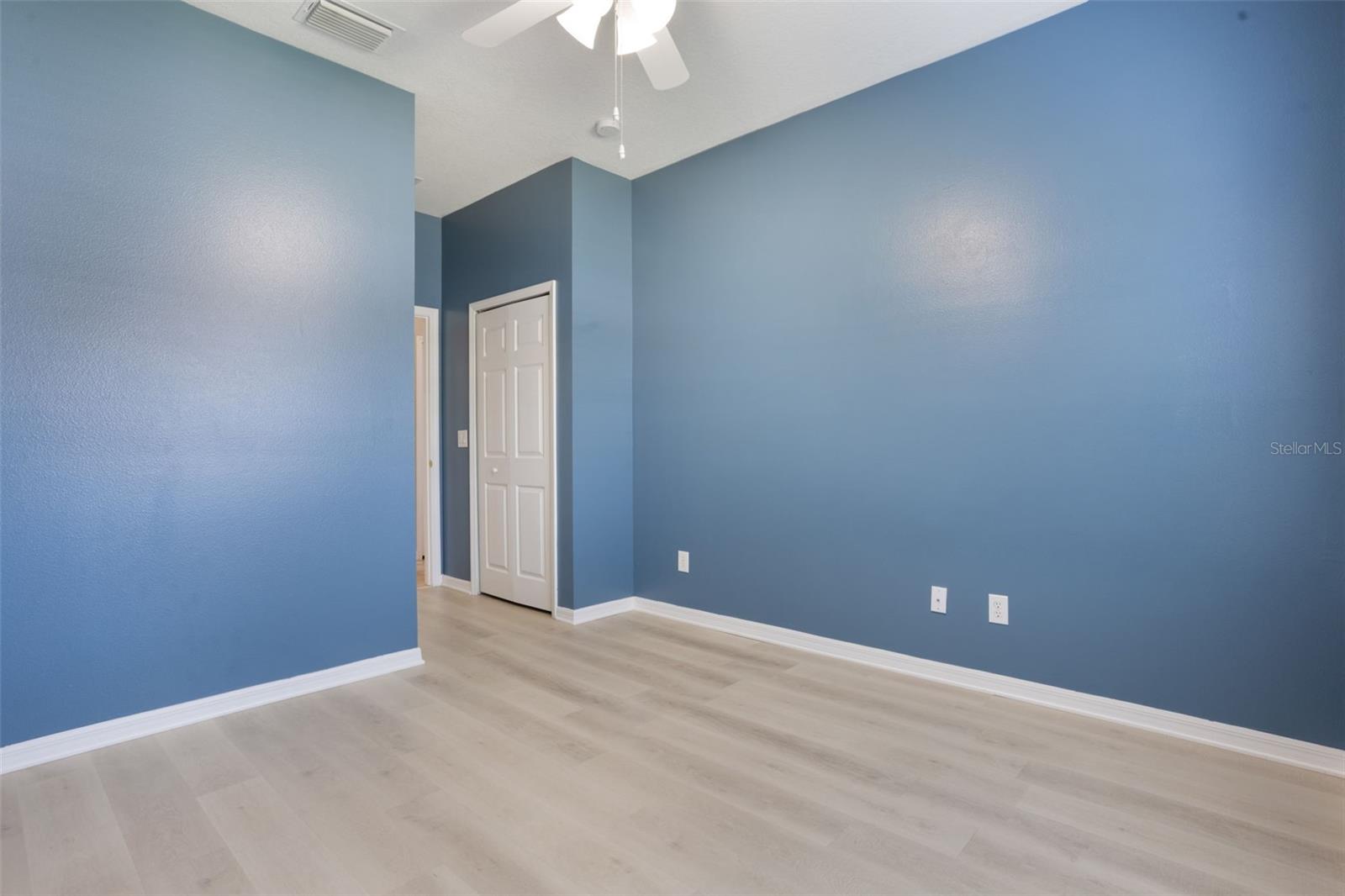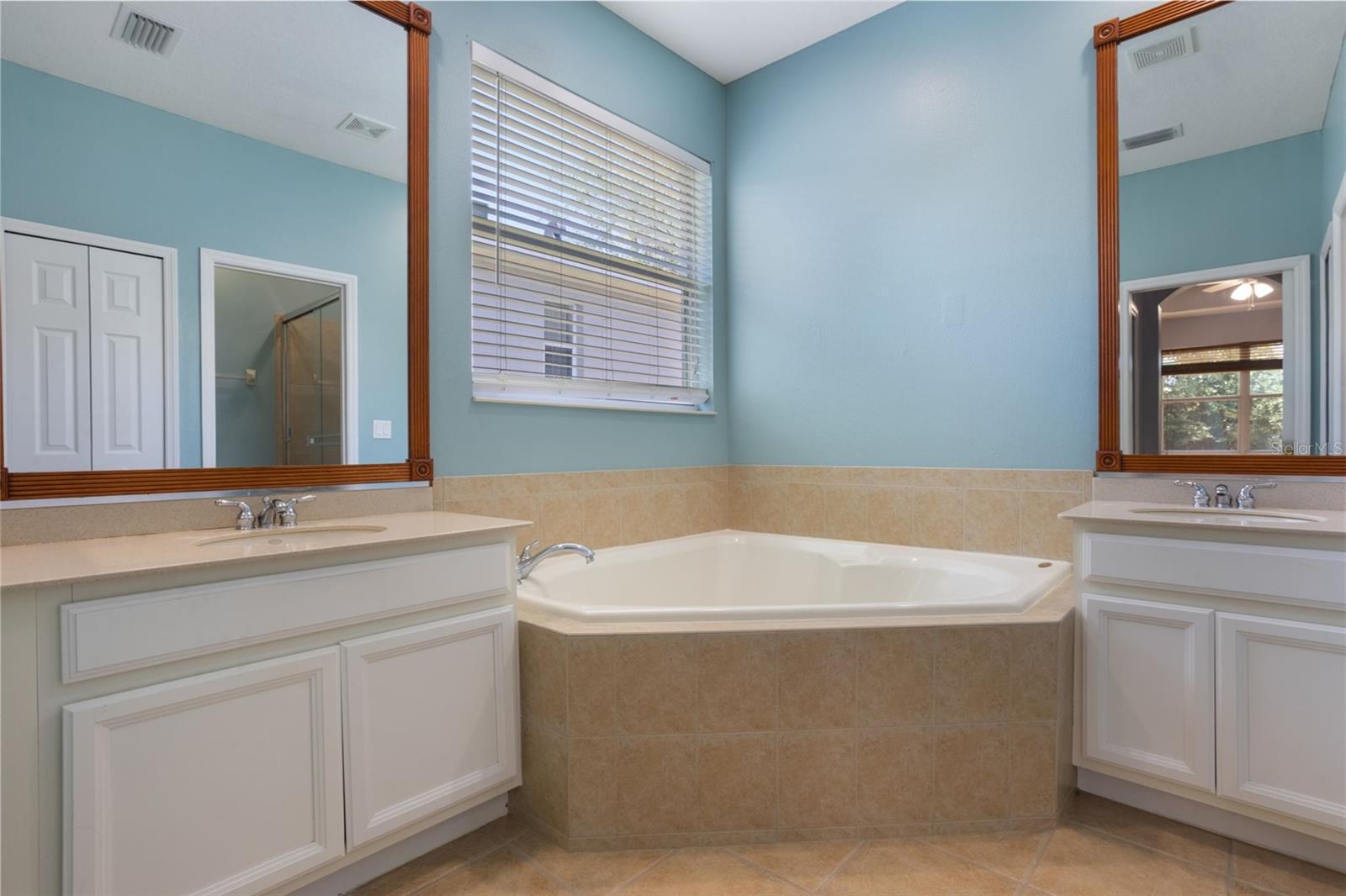 The home boasts two ancillary bedrooms outfitted with new luxury vinyl plank flooring along with a full bathroom with bathtub for little ones. The primary suite offers a spacious retreat featuring tray ceilings and maple hardwood flooring. Picture windows to the backyard allow golden afternoon light while dual closets leave ample room for clothing and storage. The primary suite also features dual vanities, a garden tub and separate shower stall.