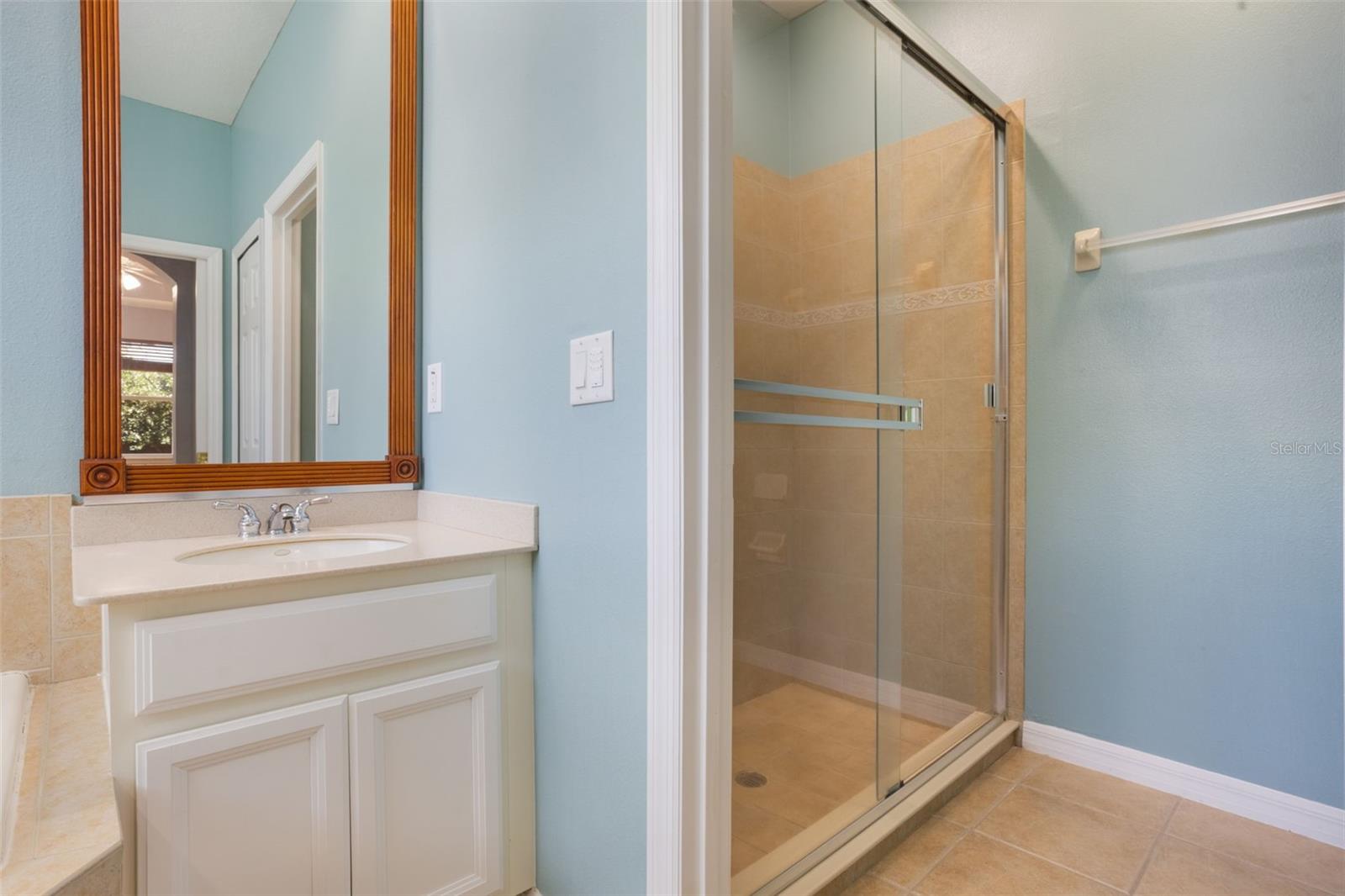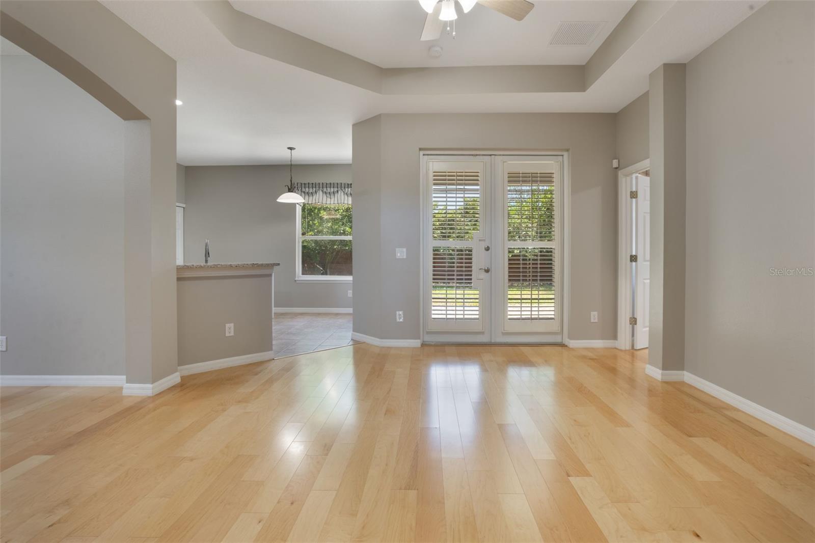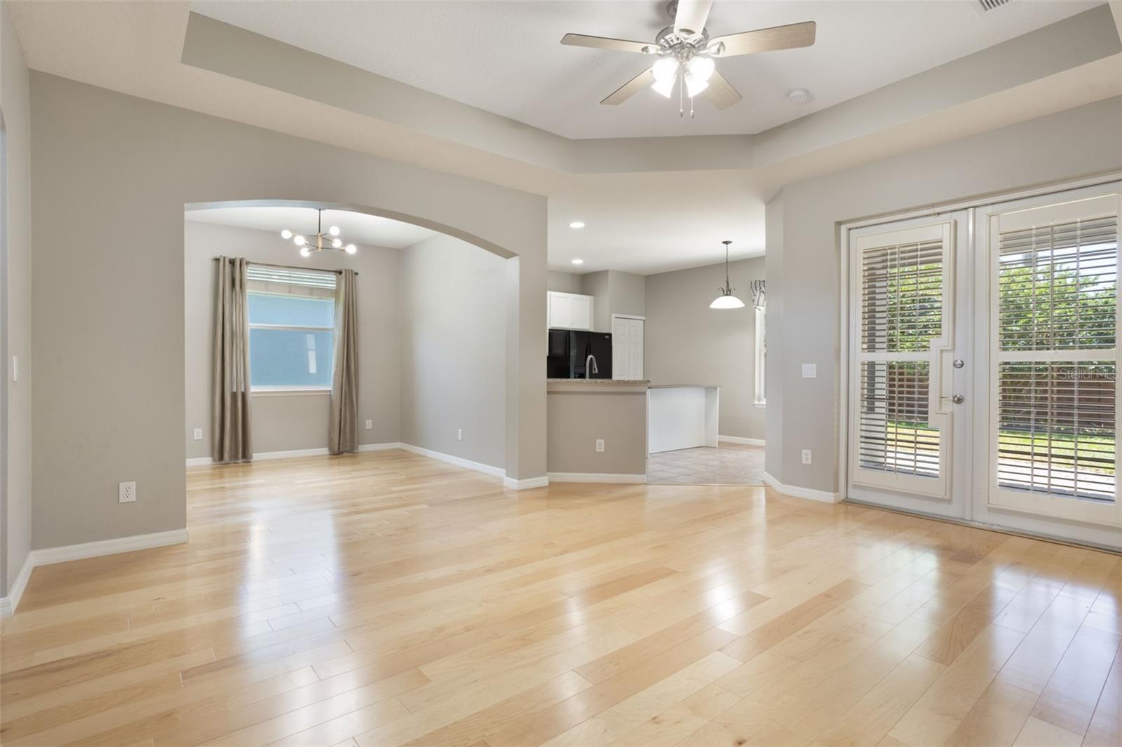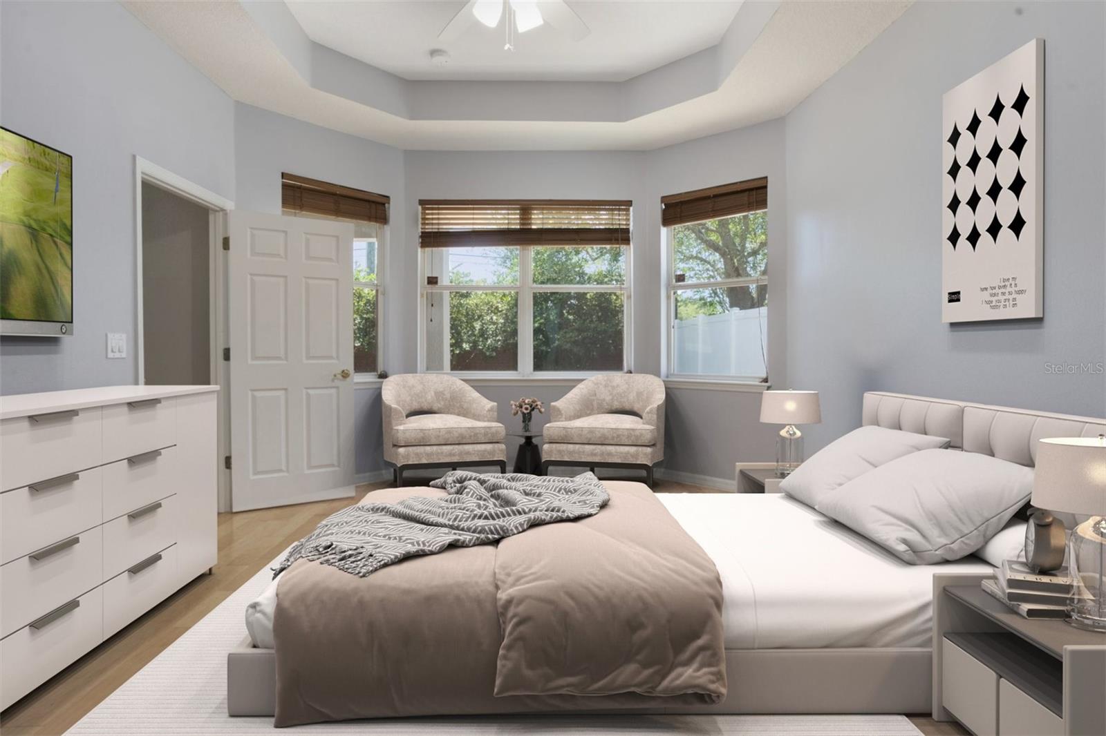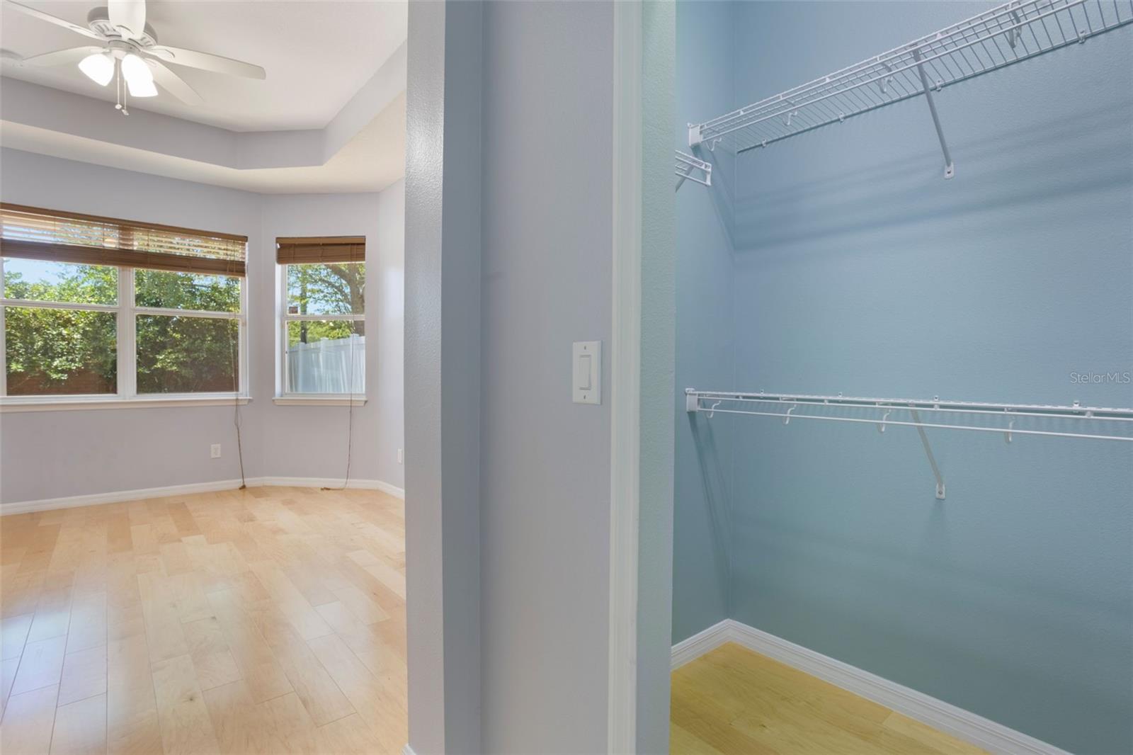 The home boasts two ancillary bedrooms outfitted with new luxury vinyl plank flooring along with a full bathroom with bathtub for little ones. The primary suite offers a spacious retreat featuring tray ceilings and maple hardwood flooring. Picture windows to the backyard allow golden afternoon light while dual closets leave ample room for clothing and storage. The primary suite also features dual vanities, a garden tub and separate shower stall.