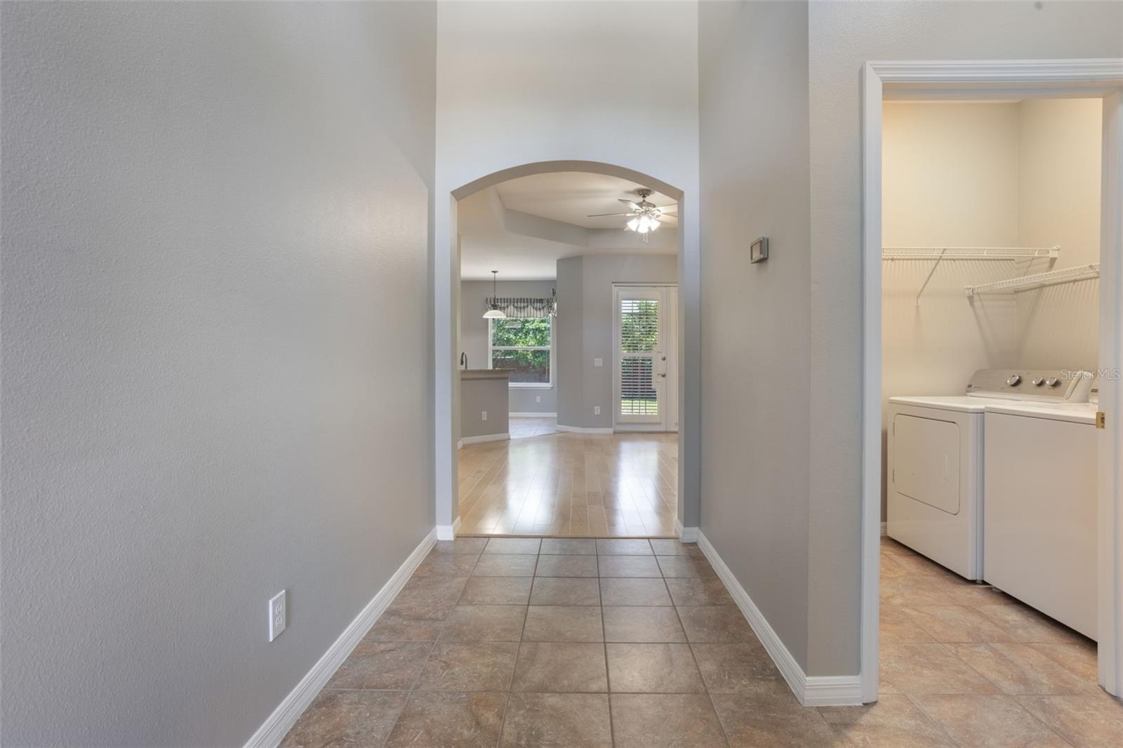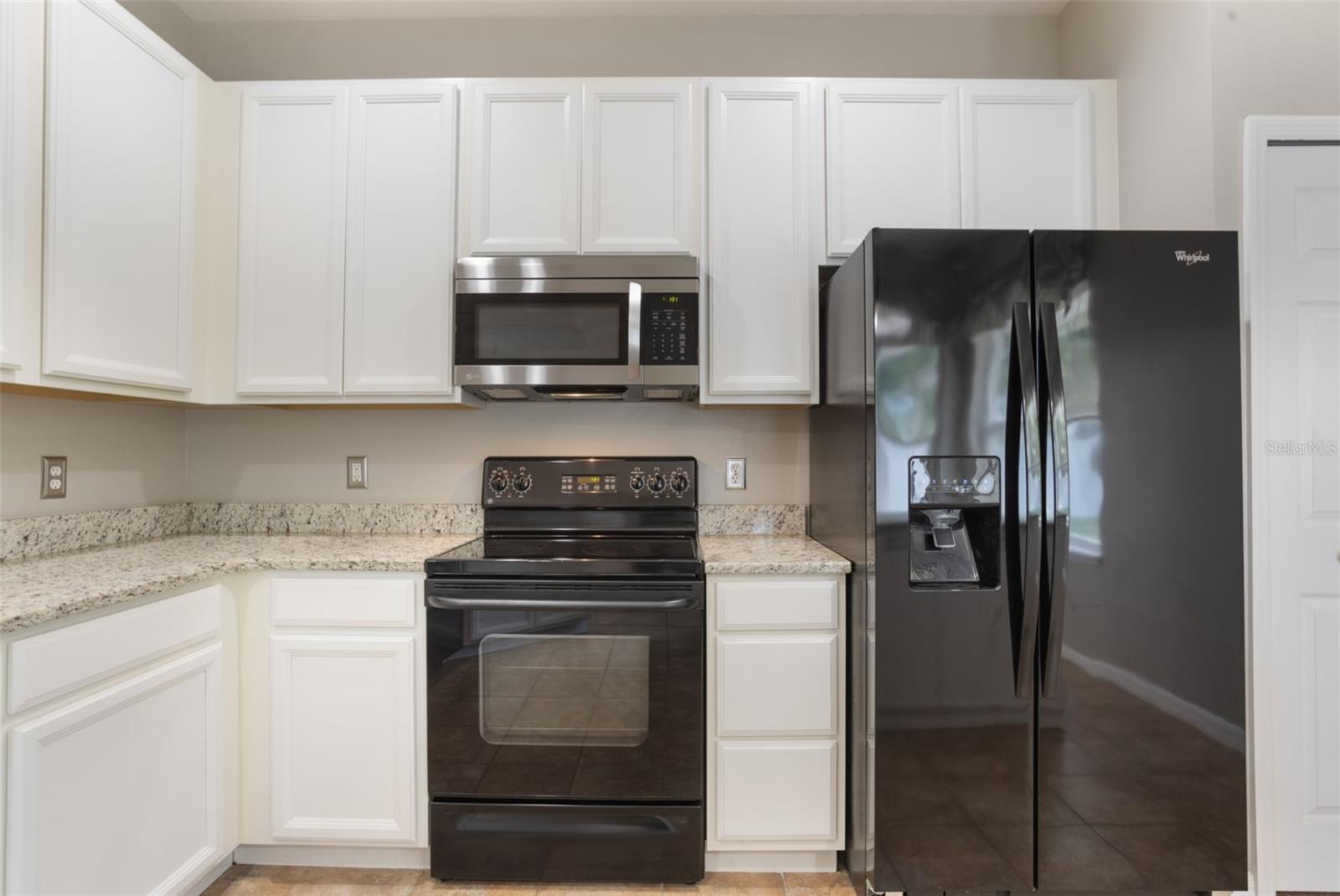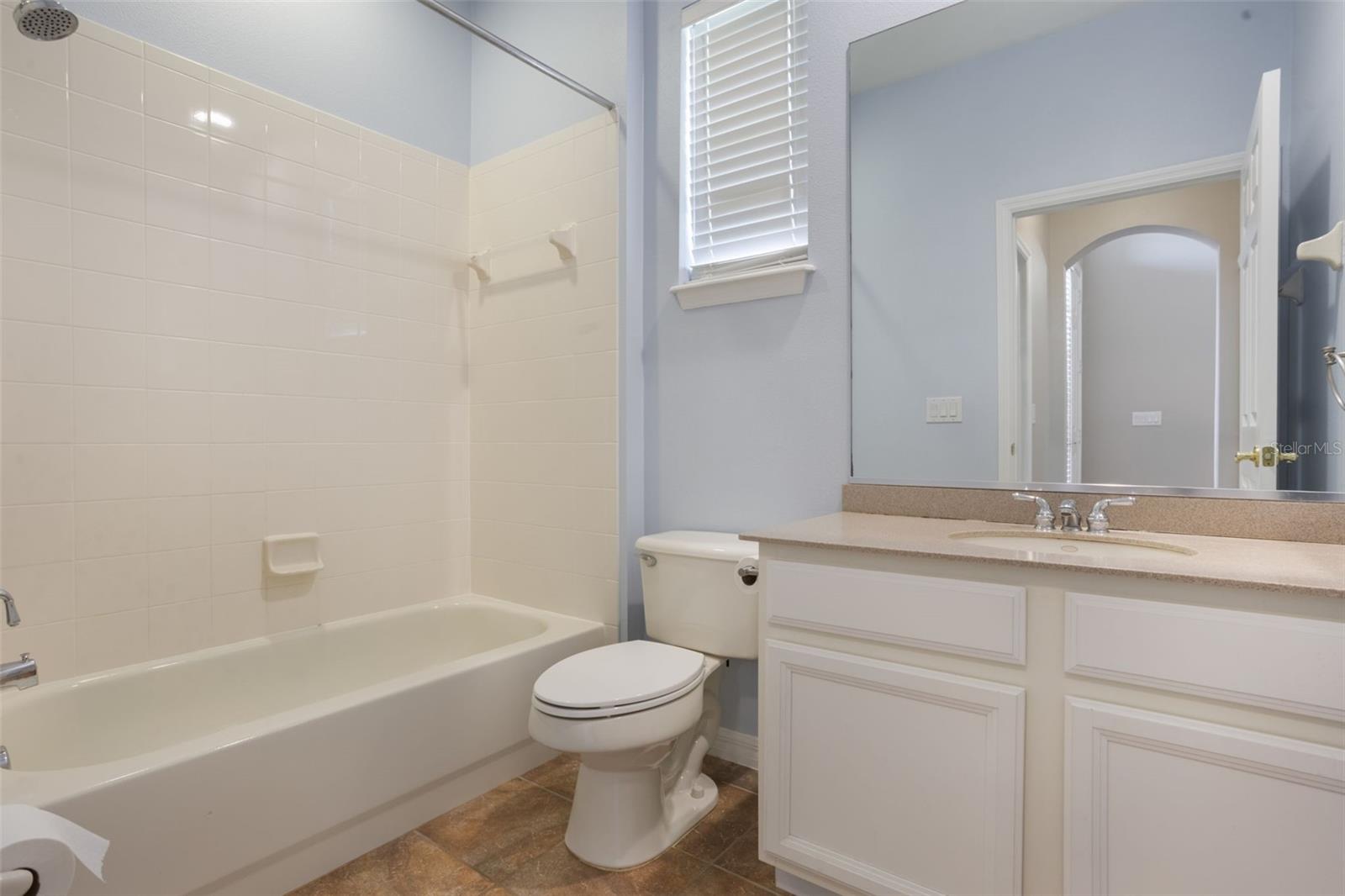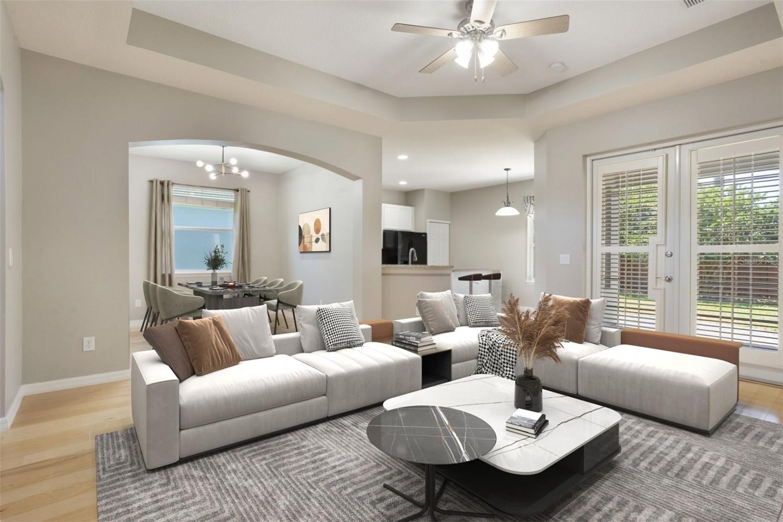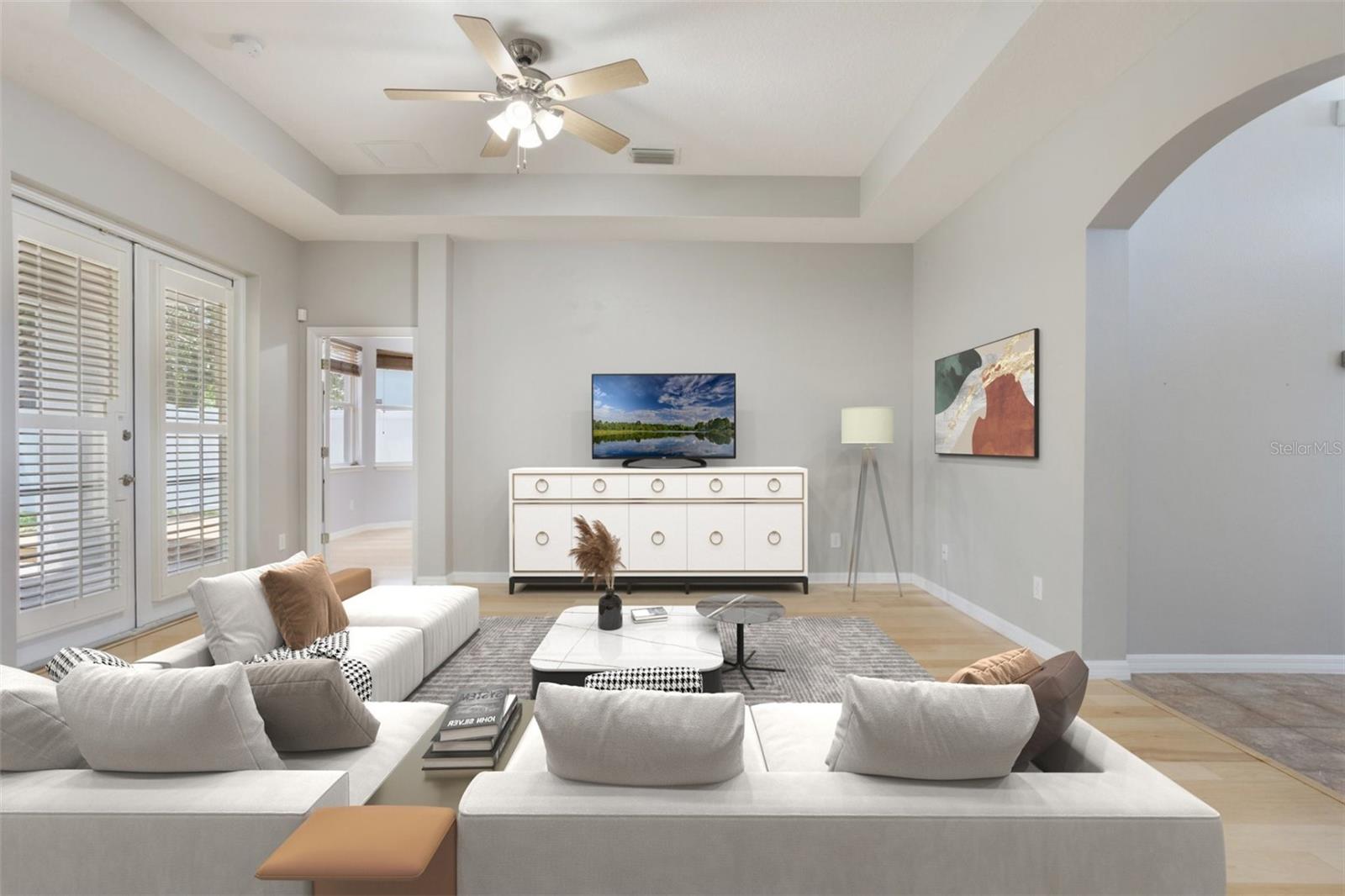 The home boasts two ancillary bedrooms outfitted with new luxury vinyl plank flooring along with a full bathroom with bathtub for little ones. The primary suite offers a spacious retreat featuring tray ceilings and maple hardwood flooring. Picture windows to the backyard allow golden afternoon light while dual closets leave ample room for clothing and storage. The primary suite also features dual vanities, a garden tub and separate shower stall.